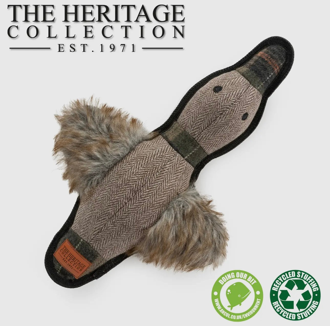 Crafted from sustainable materials, Donald the Working Duck is the perfect dog toy for play and cuddle time. With durable tweed fabric for hours of fetch and soft enough for naps, this eco-friendly toy is built to last and easy on the planet.