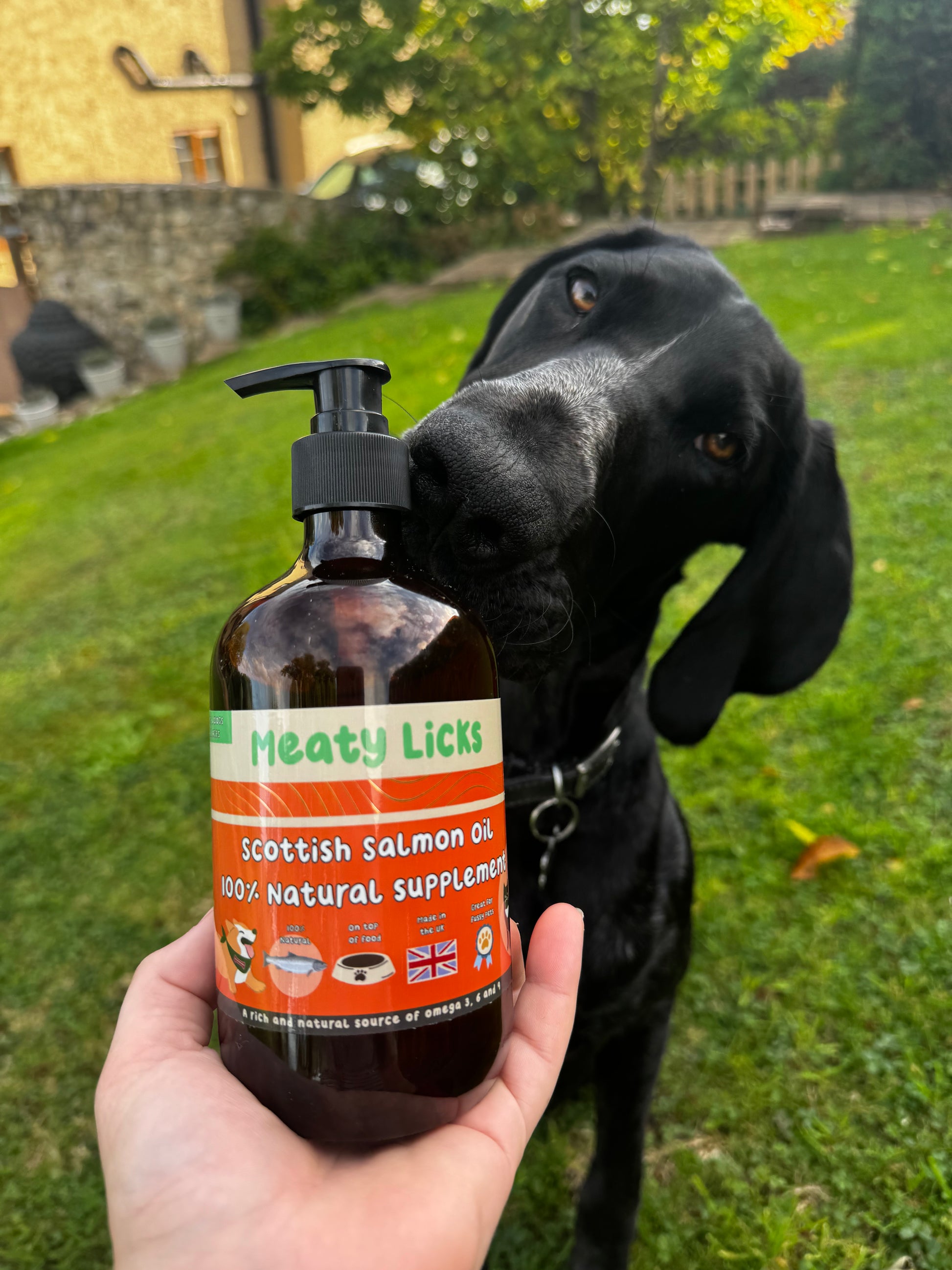 Premium Scottish Salmon Oil is a 100% natural supplement, sustainably sourced from the finest Scottish salmon and rich in omega 3, 6 and 9. These natural oils are proven to improve skin and coat conditions – reducing itchy skin and making the coat soft and glossy. This easy-to-use supplement is a rich source of omega 3 fatty acids, EPA and DHA. Also known to help brain activity and aid joint movement. It’s important to note that Omega 3 fatty acids are vital for your pet’s normal growth and development. However, your pet’s body is unable to make them on their own. Therefore, it is important we add them to our dog’s (and cat’s) diet. Daily use of our salmon oil will provide your dog with these essential acids ensuring they are happy and healthy. Sustainability sourced from the finest Scottish salmon, raised under environmentally compatible conditions in the deep-sea lochs, this pure salmon oil will also improve the taste of your pet’s food. Perfect for fussy eaters.